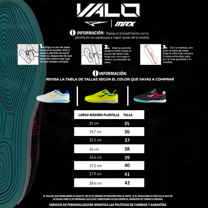 Eleva tu juego con las nuevas zapatillas VALO de Max Sport, diseñadas especialmente para el fútbol sala. Con materiales de alta resistencia, gran agarre y comodidad superior, el modelo VALO está hecho para jugadores que dominan la cancha indoor con velocidad y precisión.